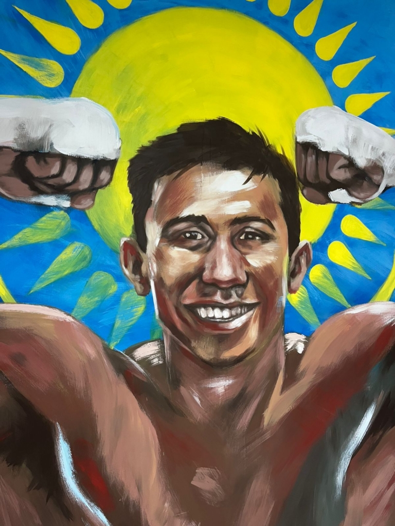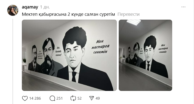 —  2021 жылы бір компаниямен жұмыс істедім, олар түскен табыстың 50% алып отырды. Ал алғашқы тапсырысым әкімдіктен түсті. Қабырғаға сурет салатын басқа бос адам болмаған соң, тапсырысты мен алдым. Өзімнің қабырғаға бірінші рет сурет салып тұрғанымды байқатпайын деп барымды салдым. Жүйелі түрде сурет салып жүрген адамдай әрекет еткенім есімде. Тапсырыс берген тарапқа салған суретім бірден ұнады. Ертеңінде тағы да ықылас білдіріп, маған таңдауы түскенін жеткізді. Осылай-осылай еңбек жолым басталып кетті.
