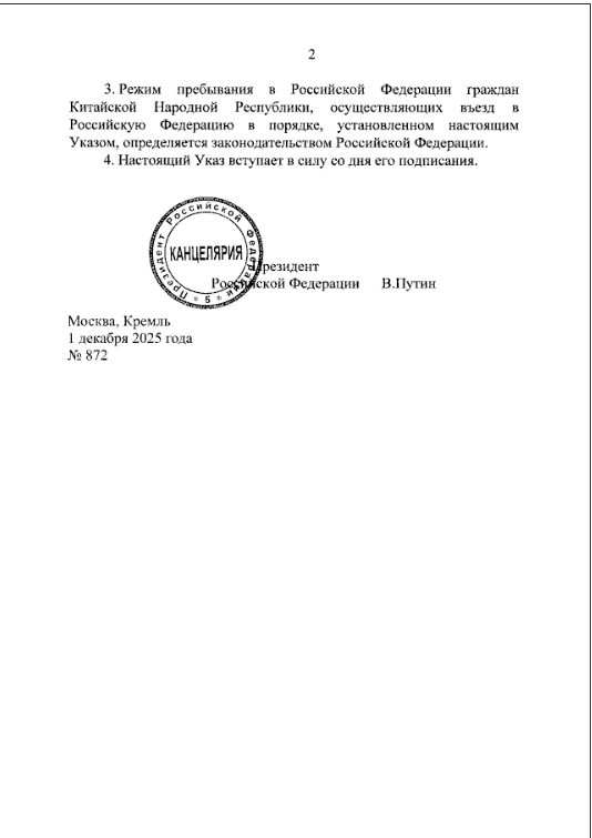 Ресей президенті Владимир Путин Қытай азаматтары үшін елге визасыз кіру режимін енгізу туралы жарлыққа қол қойды. Құжатқа сәйкес, Қытай азаматтары Ресей аумағында визасыз 30 күнге дейін бола алады. Жаңа тәртіп 2026 жылдың 14 қыркүйегіне дейін күшінде болады.