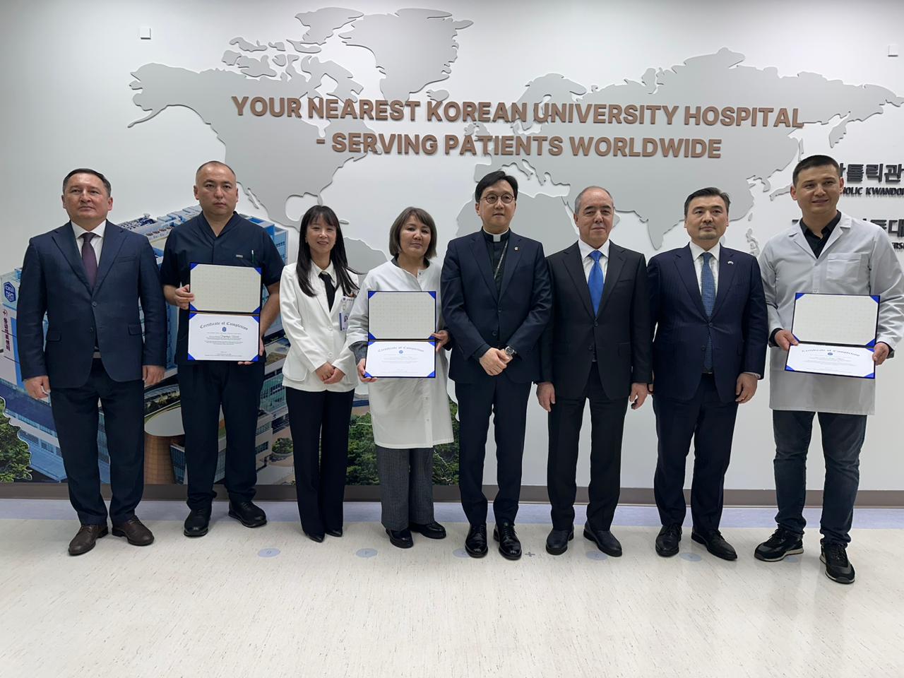 В завершение визита врач-хирург областной многопрофильной детской больницы Ахмет Орын, врач-невролог Акжаикской районной больницы Ермек Тургынбаев и медсестра областной многопрофильной детской больницы Алия Адилова, прошедшие стажировку в данной клинике, были удостоены сертификатов Международной клиники Святой Марии.