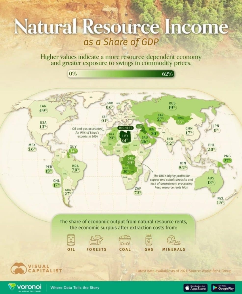 Дүниежүзілік банк тобының деректеріне негізделген жаңа визуализация табиғи ресурстардан түсетін табыстың жалпы ішкі өнімдегі (ЖІӨ) үлесін көрсетеді. Зерттеуде ресурс рентасының үлесі есепке алынған. Бұл — мұнай, газ, көмір, пайдалы қазбалар мен орман ресурстарын өндіруден түсетін, шығындар шегерілгеннен кейінгі экономикалық табыс.